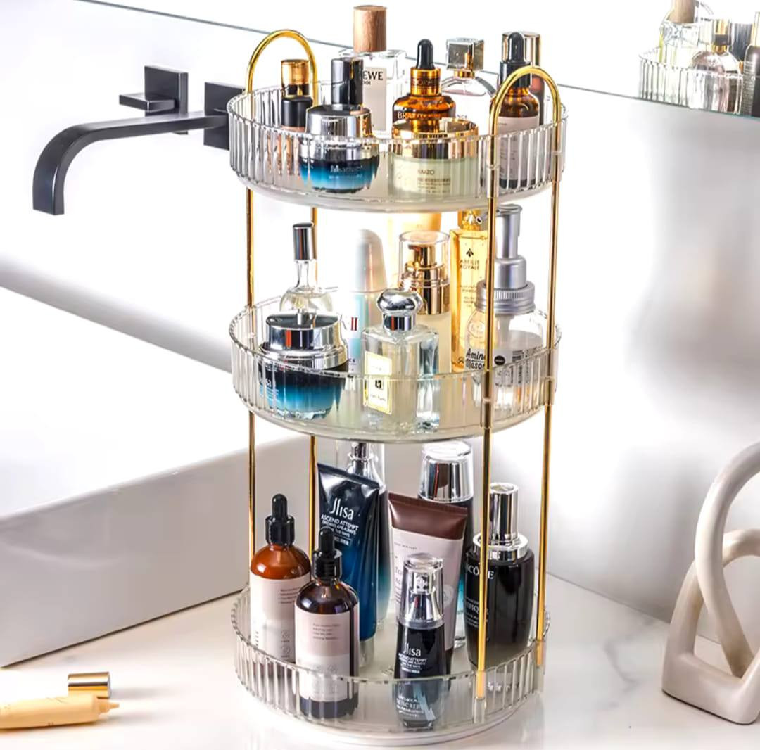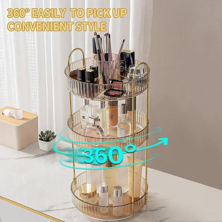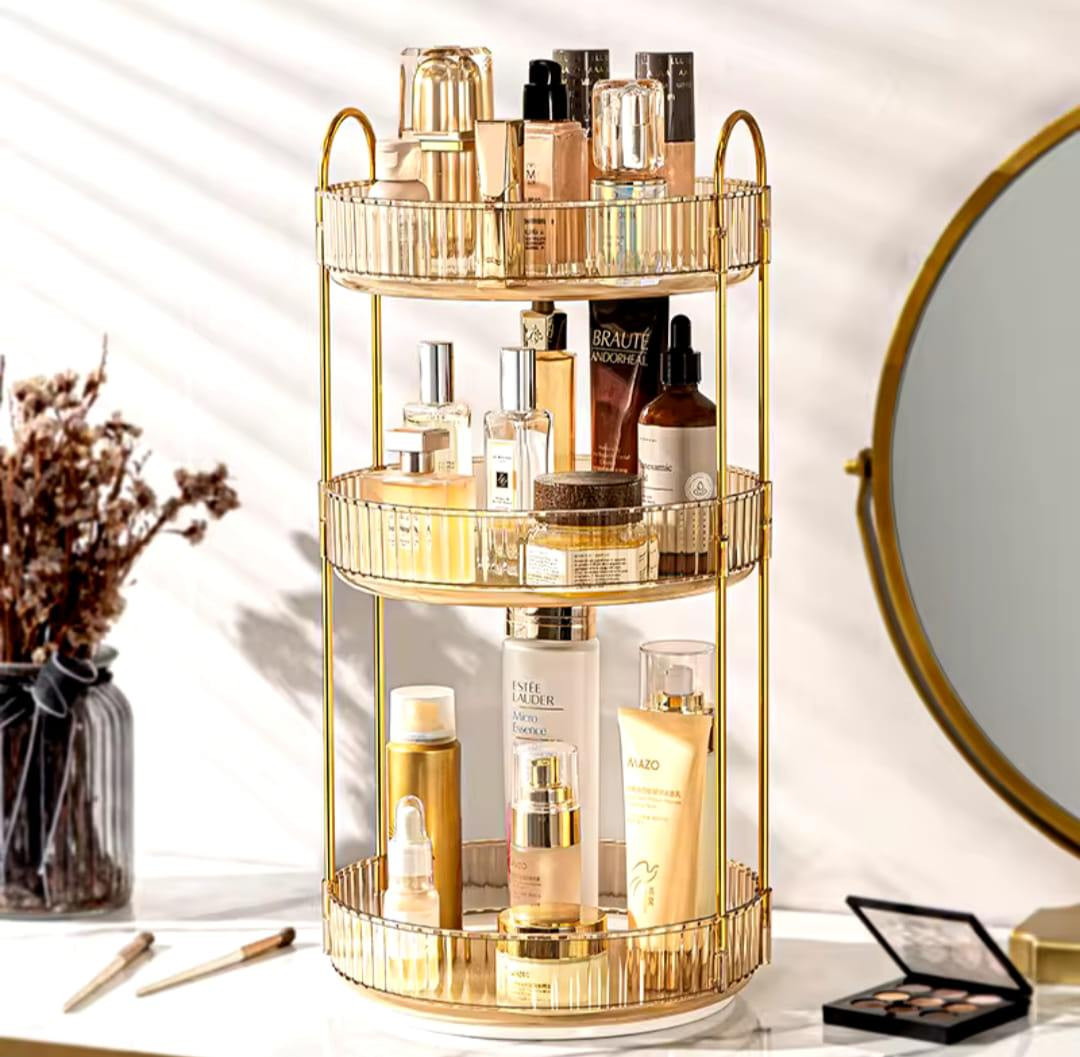 3 Layers Light Luxury Makeup OrganizerPrice: 2250 TakaMaterial: Pet + Metal360° movementSuperior Material & Simple InstallationMultipurpose UseDimensions: 47 by 23 cmFor order please click "Order Now" button