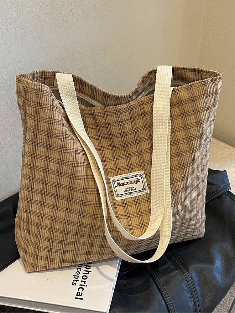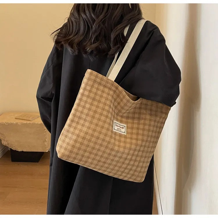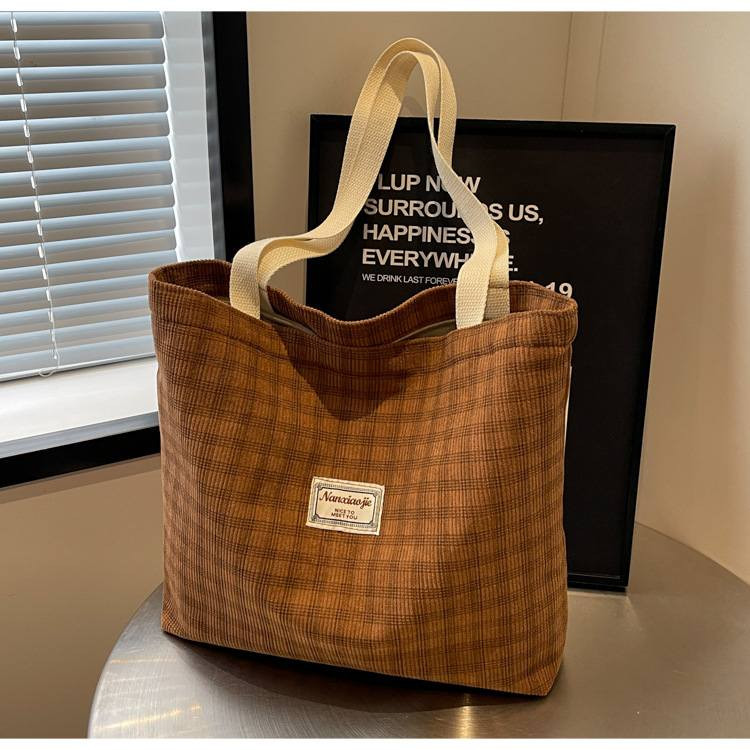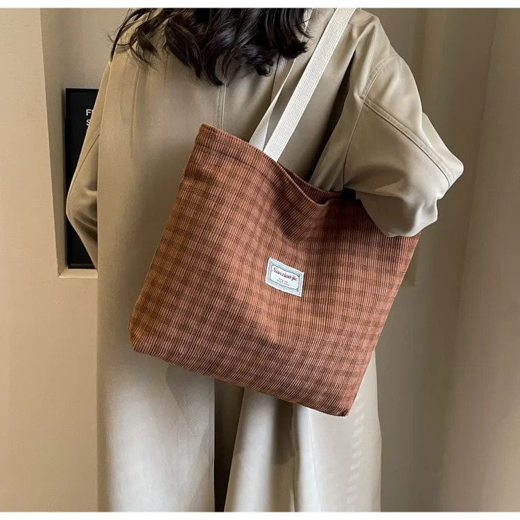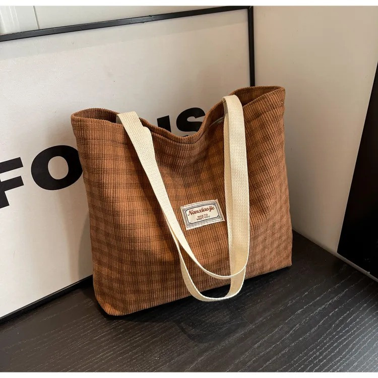 Large Capacity Shoulder Tote BagPrice: 750 TakaMaterial: CorduroyBag Size:Top Width: 41 cmBottom Width: 35 cmHeight: 33 cmThickness: 8 cmHandle Length: 29 cmOpening method: ZipperAvailable Colors:Brown, Khaki