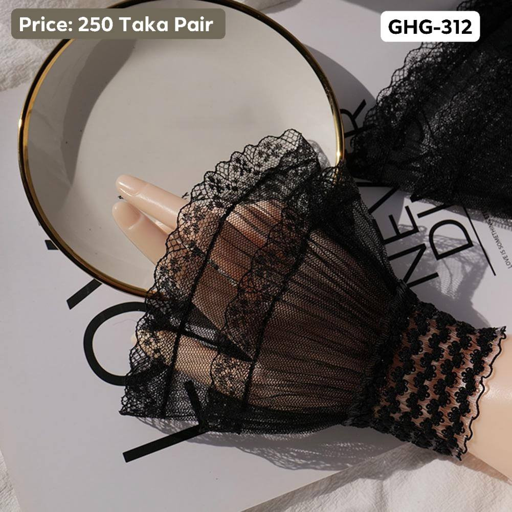 Design: The cuffs feature a pleated, ruffled lace design with a beaded or pearl-like pattern around the wrist. They are fingerless.