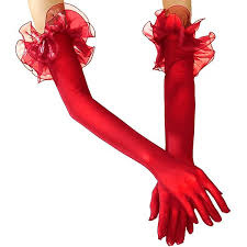• Design: The gloves are long, often reaching the elbow or beyond, and feature ruffled cuffs with pearl-like embellishments.
